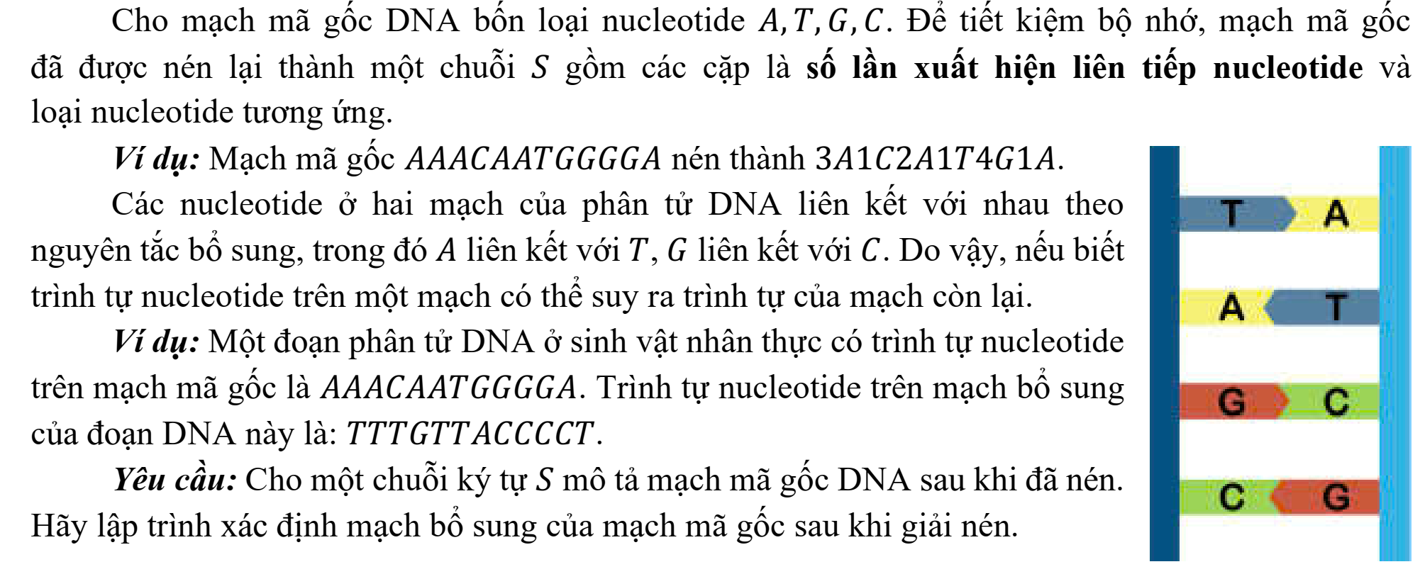 Có 20% số test ứng với 20% số điểm của bài thỏa mãn: độ dài chuỗi S là 2, trong đó ký tự đầu tiên là chữ số, ký tự thứ hai là một trong 4 chữ cái A, T, G, C;